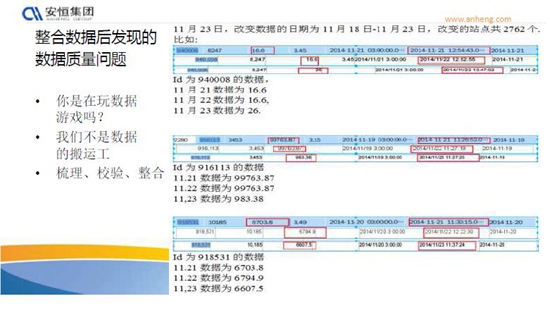 王志军指出,整合数据后发现数据质量问题,我们不是数据的搬运工,当数据*关联,很多事情就会自然凸显出来。上图是*个水量采样的记录,这样*个水样采样记录跟其它的对比发现它不停地变动,用户说不应该这样。因此我们去追踪这个数据在哪儿发生的变动,发现同*个数据源在不同的日子中会变化。上图是三个时间的变化,用户说用了好几年都没发现,但是这种数据的整合在这个系统中是遇到*多的。当数据整合以后,按照用户的需求,双方可以协商怎么把数据呈现。王志军表示,漏损控制系统不能只是数据展示,它要为客户提供更多的帮助。